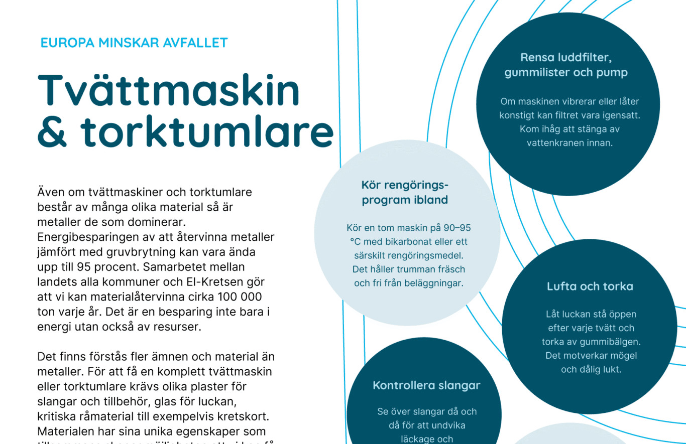 Tvättmaskiner och torktumlare består av många material som påverkar miljön på olika sätt. Metaller som järn, koppar, aluminium och zink kräver energikrävande gruvbrytning som sliter på marken och orsakar utsläpp. I elektronikdelarna används många olika metaller. En del av dessa klassas som ”kritiska råvaror” eftersom tillgången är begränsad. Andra klassas som sällsynta eftersom de är just ovanliga och enbart finns i låga koncentrationer. Utvinningen kan ge giftiga restprodukter och kemikalieläckage.